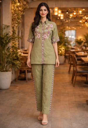 Pista Green Cotton Silk Embroidered Co-Ord Set