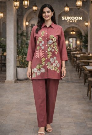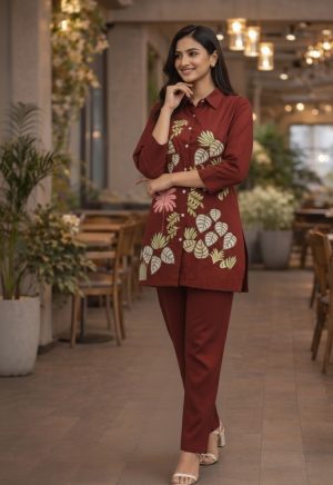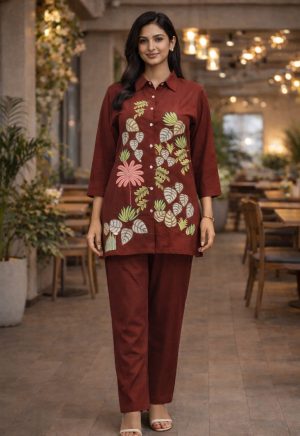 Maroon Cotton Silk Embroidered Co-Ord Set