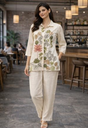 Off-White Cotton Silk Embroidered Co-Ord Set for Women – Festive & Office Wear