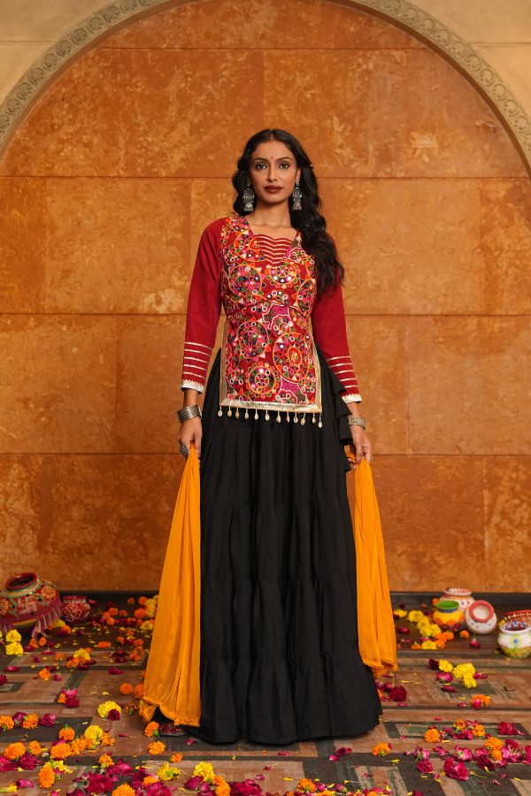 Celebrate the rhythm, color, and energy of Garba nights with this stunning Black Lehenga featuring a Mirror Work Top and a Mustard Dupatta. This vibrant three-piece set beautifully blends tradition with modern flair, designed to turn heads while keeping you comfortable through every twirl and dance move.
