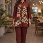Overall, this brown embroidered co-ord set is ideal for office wear, festive styling, casual outings, and social gatherings. Because of its elegant embroidery and contemporary tailoring, it beautifully combines traditional craftsmanship with modern fashion sensibilities. As a result, this cotton silk co-ord set becomes a wardrobe essential for women who value comfort, premium design, and versatile styling.